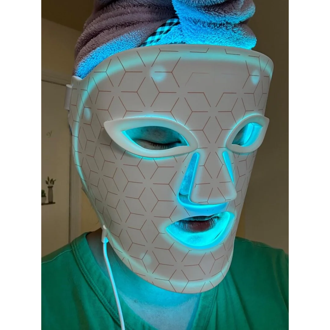 It uses red, blue, green, and yellow light therapy to stimulate collagen, reduce acne, fade dark spots, and calm sensitivity, promoting a smoother, brighter complexion.